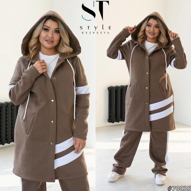 Костюм тройка выполнен из плотного трикотажа , внутри с небольшим начесом. Трикотаж умерено эластичный, приятный.