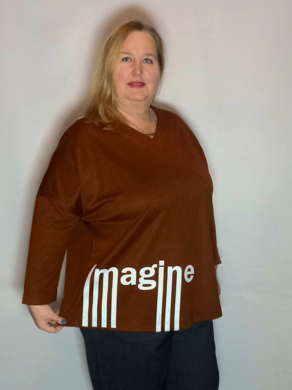 Демисезонная коричневая блуза с принтом свободного кроя выполнена из мягкого дышащего трикотажа.
