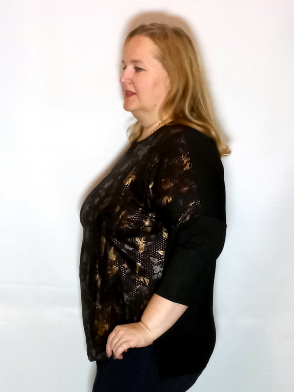 Полочка сложнокроенная, основная часть из трикотажа с рисунком, по середине вставка вертикальной полосы из однотонного трикотажа, которая декорирована черными термостразами.