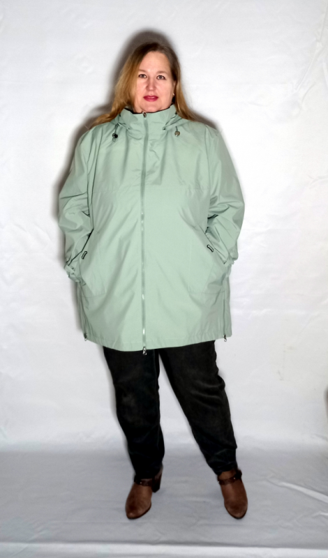 Глубокий капюшон, отстегивается. Внутренняя его поверхность из ткани с рисунком ( такой же декор  на рукавах и на полочке вставка в области карманов.